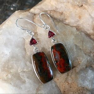 Dramatic rectangular cabochons of red Moroccan seam agate & trilliant faceted garnets set in handcrafted, solid 925 sterling silver earrings with French ear wires. Variations in natural stones make these earrings one of a kind! 2" long; each agate is 20mm x 12mm, garnets are 5mm3