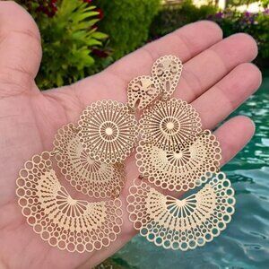 Intricate filigree crafted earrings in a flat chandelier style. Design changes a bit on each disc.