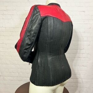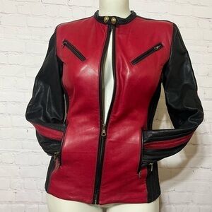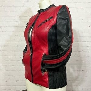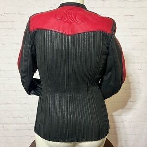 Red Leather up front and the back is strips of leather and stretchy material so it makes this jacket stretch to a bit bigger size than it’s stated size 6 or 42 Italian size