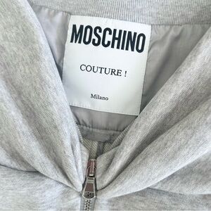 Moschino Couture sweatshirt minidress gray flare. Wide shawl collar, zip front, fit-and-flare silhouette. Ribbed cuffs and hem. 100% cotton. Excellent used condition: no stains, holes, or pills.