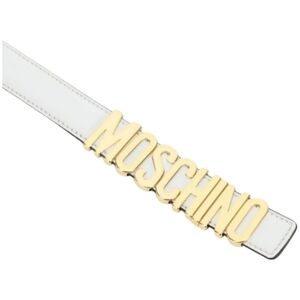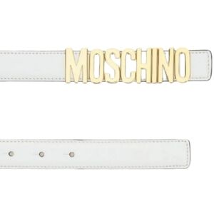 Women's belt from MOSCHINO is made in calfskin and is embellished on the front by the iconic lettering logo in brushed gold. It features an adjustable pin buckle clasp and contrast interior. Approx .75" wide. Color is off-white.