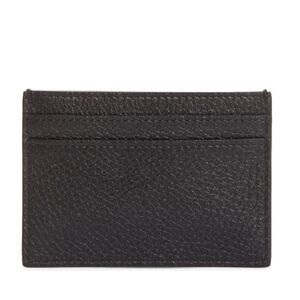 A goldtone logo glams up this grained calfskin leather card holder featuring a center pocket for stashing cash or receipts.