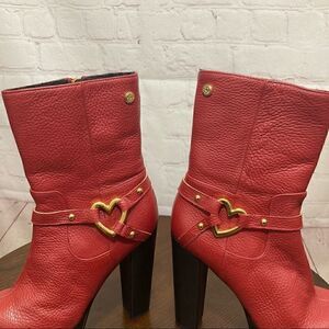Very Cool 90’s Spice Girls vibe. Red Pebbled Leather with a faux fur lining Very comfortable Used as display still like new condition. Description Love Moschino Leather Mid-Calf Boots Red Round-Toes Block Heels with Platform Wrap-Around Straps & Exposed Zip Closure at Sides Details Size: 37 (7) Heels: 5.25" Platforms: 1.75" Make an offer now or like for price drop updates. check out my closet for more great items. Bundle and Save! Make an offer 22222 bbbox