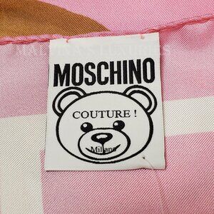 Unique Features: Vibrant Silk Twill Square Scarf, Printed with Moschino's Graphic Mascot - Teddy Bear from a signature theme seen throughout Moschino's tongue-and-cheek collections (this scarf features a paper doll version of the bear). Signature Detail