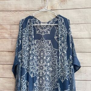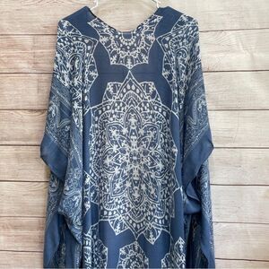 EXCELLENT CONDITION MOSS ROSE BANDANA PRINT DUSTER IN BLUE ONE SIZE PIT TO PIT 38 INCHES SHOULDER TO HEM 42 INCHES