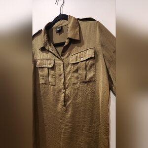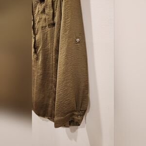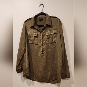 Stylish olive green blouse. Features button-up front and chest pockets. Perfect for casual wear.