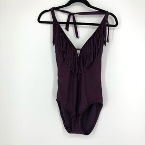 Mossimo plum purple v neck fringe one piece halter swim suit. Size womens Small.