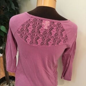 Mossimo soft purple tee XS gently used no stains or tears lace detail on sides and upper back approximate pit to pit 17 shoulder to hem 19photos show pink but it’s definitely purple