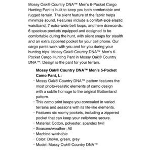 Details: MOSSY OAK Country DNA Cargo Pants. Silent feature of the fabric helps minimize sound. Comfort-side elastic waistband, 7 extra-wide belt loops, and hem drawcords. 6 spacious pockets, silent snaps. Zippered pocket for cell phone. All seasons.