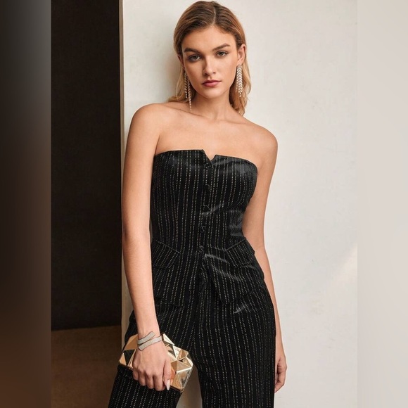 Chic strapless jumpsuit with subtle stripe detail. Perfect for elegant occasions. Sleek and stylish design.