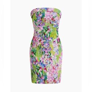 Absolutely a stunner with a beautiful Monet inspired array of watercolor florals on a green linen background. Side Zipper and pencil skirt. Bust has stretch. Lined so it is not sheer.