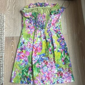 MOTF Linen Floral Print Shirred Back Strapless Mini Dress Large