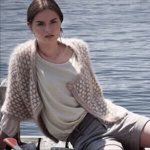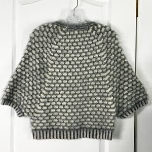 Cardigan Sweater Cape..Angora-Rabbit-Hair Wool blend.Fluffy.Grey Ivory/White Circles Pattern.Ribbed Details.Knit.3/4 Sleeve.A-Line.Crop Waist Length.