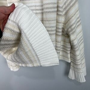 Pre-owned, great condition. White/cream/beige textured line knit sweater with open front and wide/flare sleeves. Cotton blend. Pit to pit= 22”, shoulder to hem= 22”.