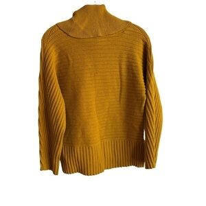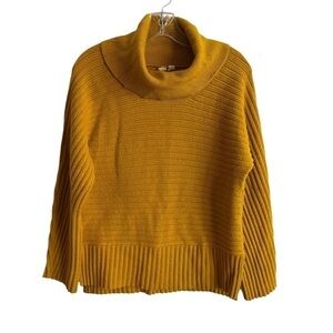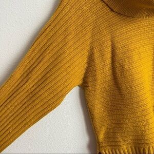 MOTH x ANTHROPOLOGIE Mustard Brenta Cowl Neck Sweater. cowl neck; long sleeve; pullover style; curved hem; extremely soft knit; ribbed detailing; side slit hem.