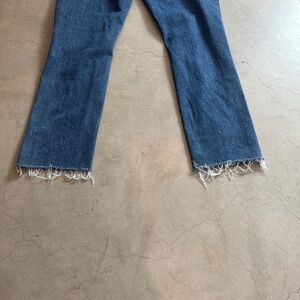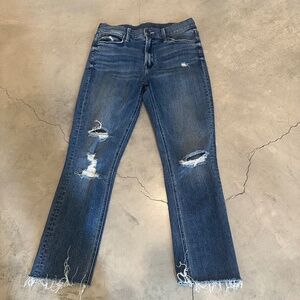 Stylish blue ankle jeans. Distressed details. Frayed hem. Perfect for casual wear.