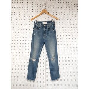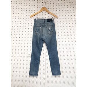 Experience timeless style with MOTHER's blue straight leg jeans, featuring a high-rise waist and a classic straight cut. The medium-light wash denim offers a vintage-inspired fade, adding character and dimension to your look. Perfect for a relaxed, casual aesthetic.