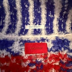 Stylish knit sweater with vibrant blue and red patterns. Soft and cozy texture.