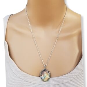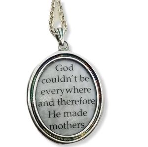 Lovely silverplated pendant with a cameo of the famous mother and children painting by impressionist painter Mary Cassatt. The other side of the pendant reads "God couldnt be everywhere and therefore He made mothers" The pendant is on a sterling silver chain that is stamped 925 JCM near the clasp. Necklace chain measures 20 inches in length. Pendant measures 1-1/2 inches tall and 1 inch wide. Excellent, like new, condition.