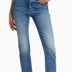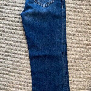 These have a really flattering stretch fabric, medium wash, and subtle fray at the ankle. Rarely worn and like new!