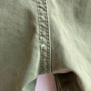 In excellent preowned condition, one pair of MOTHER Denim The Looker Killing Fatigue w. Red Stripe Skinny Jeans in women's size 30. Detailed with a warm toned painted side stripe, Mother Denim's Looker Jean in Fatigue/Red are a customized army green coloured skinny legged style with a full hem. These skinny jeans feature a mid-rise waist and a zip closure, ensuring a comfortable and secure fit. The cotton blend fabric is washed in green, giving it a unique, eye-catching look that is perfect for any casual occasion. These jeans from MOTHER's The Looker collection are designed with striped accents, giving them a subtle yet stylish touch.