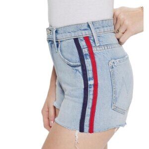A classic daisy-duke inspired denim short, updated with a nautical twist, zipper fly and button closure & unfinished hem! Red and navy tuxedo striping on each outer leg, and an embroidered anchor and rope detail on the back pocket. Sail away!