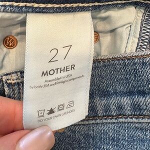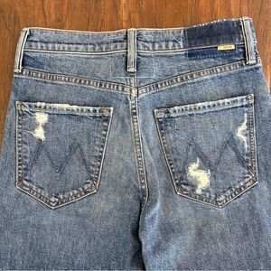 I love these but need a different size. Experience the perfect blend of style and comfort with MOTHER's high rise jeans, featuring a classic blue hue and authentic distressed details. The high rise design offers a flattering fit, while the natural fading and subtle wear patterns add a vintage touch. Ideal for casual outings, these jeans are a wardrobe essential. They are from the Mother Superior Line. 98% cotton & 2% elasthane. 5 pocket styling with button fly. The rise is 10 3/4 inches, the inseam is 26 inches and the waist laying flat is 14 1/2 inches.