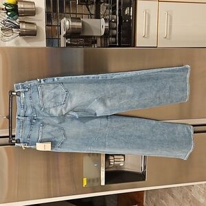 Thank cod you're here. Super high-rise jeans with a loose wide leg, button fly with a clean hem. Cut from comfortable stretch denim, Fish Out Of Water is a light blue wash with fading and whiskering.