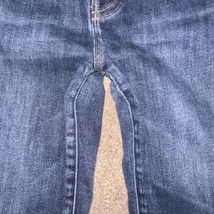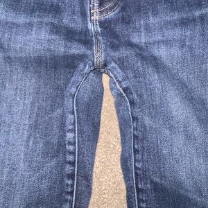 Indigo denim jeans featuring copper button and metallic brand tag. Classic style with sturdy construction.