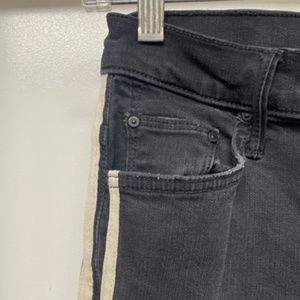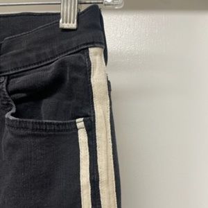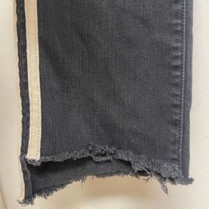 racing stripes down the sides and an uneven hem. High Rise. Distressed. Button and zip closure. 5 pockets. Cropped with frayed cuffs.
