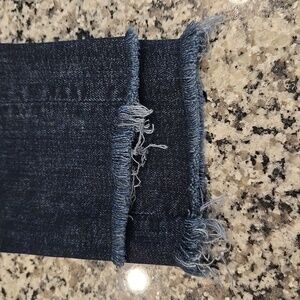 Zip fly with button closure. 5 pocket design. light whiskering and faded detail. Frayed, Raw-Cut Hem. Ample stretch.
