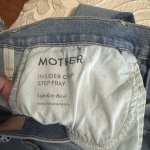 Chic and versatile straight leg jeans. Raw edge hem. Light blue wash for a modern look. Dark blue stripe on sides. Perfect for everyday wear.