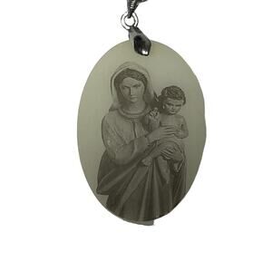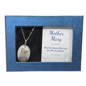 This graceful MOTHER MARY pendant necklace comes beautifully presented in its original gift box, featuring a serene image of Mary and Child for a meaningful expression of faith. The silver tone chain offers a classic look perfect for devotional wear or gifting.