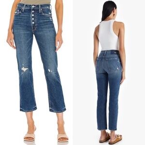 Sink your teeth in. Mother's bestselling Pixie Tomcat high-rise straight leg jean with an ankle-length inseam. An exposed button fly offers a flattering waistline. Crafted from versatile semi-rigid denim in a classic indigo wash with destroyed details.