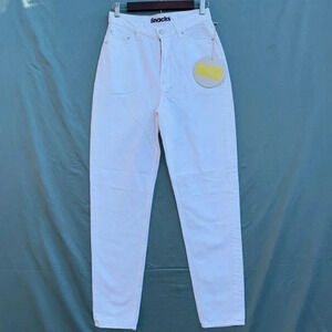 Sweet and salty. A straight-leg jean from SNACKS!, MOTHER's homage to throwback styles of the 80s and 90s, reimagined for a new generation. The high-rise jeans feature a slightly v-shaped waistband, loose fit and 31-inch inseam. Made from rigid 100% cotton, Sticky Rice is a clean white hue that channels the nostalgia of snack time with a pretzel-detailed button and candy-inspired interior rivets.