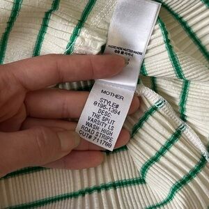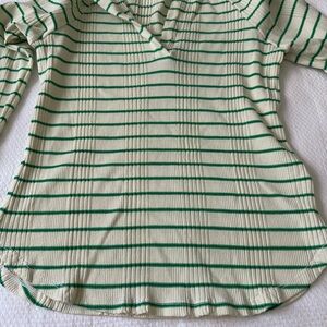 ❗️ The stock photo looks more white, but the actual base color is an ivory with a yellowish tone with green stripes.