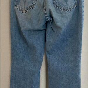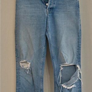 Trendy light blue jeans with a straight leg cut. Features stylish distressed details. Perfect for casual wear.