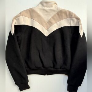Chevron colorblocking draws the eye to this zip-up jacket complimented by ribbing along the cuffs and hem. Front zip closure Stand collar with button throat latch Long sleeves Ribbed cuffs and gem Lined, with 100% polyester fill 65% polyester, 25% wool, 10% acrylic with 90% polyester, 10% elastane contrast Dry clean