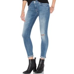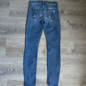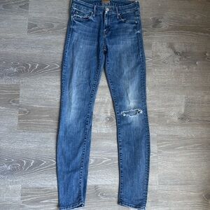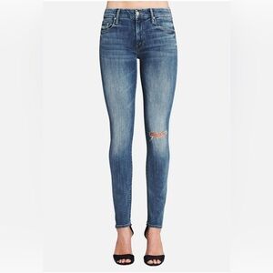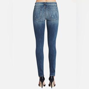 The Looker Jean in High Five by Mother Denim is a skinny fitting style that features destructed detailing on the left knee, and light fading on the thighs. They also feature whiskering along the hips. They have a low rise of 8 inches and are detailed with matte rose gold hardware.