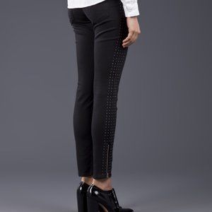 Ankle zip looker jean in big black stud from MOTHER. This skinny jean features a five pocket design, a zip fly with a button closure, belt loops, and tonal stitching throughout. Has zippers at the ankles and silver-toned stud detail at the pockets & sides.