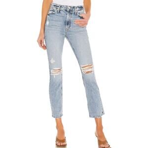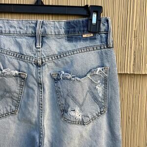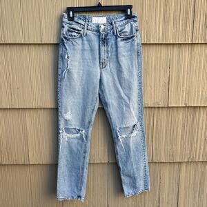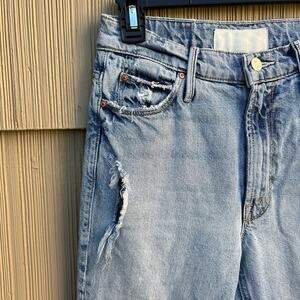 MOTHER 'The Dazzler Ankle' in Lost It (light blue wash). Slim fit leg. Zip fly with button closure. 5-pocket styling. Intentionally distressed detail. Some signs of wear. Distressed hole on upper thigh is slightly more ripped than stock photo. In otherwise great condition. Size 25 - 13" waist; 11" rise; 27" inseam.