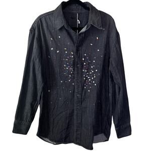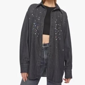MOTHER "The Extra Roomie Frenchie" denim button-front shirt featuring rhinestone embellishments.