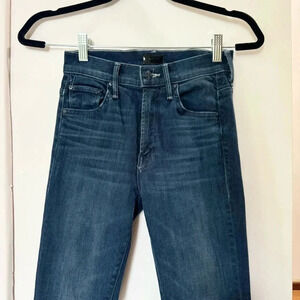 The goods. This iconic high-waisted bootcut hits at the ankle with a frayed step-hem. Made from versatile stretch denim, Good For You is a dark blue wash with black hardware, whiskering and subtle fading at the knees. MOTHER knows best.