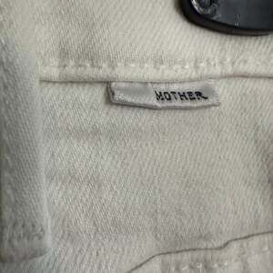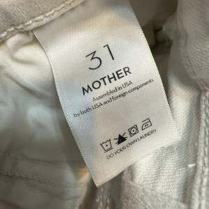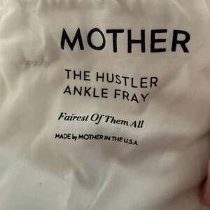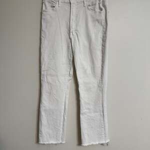 Mother The Hustler Ankle Fray jeans in 'Fairest Of Them All' (white). These high-waisted jeans feature a cropped, bootcut silhouette with a raw, frayed hem. Made with a comfortable blend of 94% cotton, 4% polyester, and 2% elastane, they offer a slight stretch. Crafted by Mother in the USA. Please note there is a small light stain on the right leg, as shown in pictures.