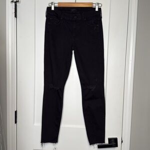 These cropped, stretch-denim jeans are enhanced with a slim fit and frayed step hem.