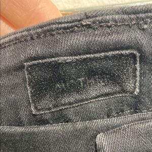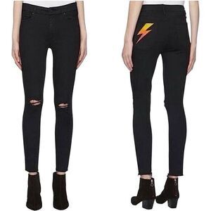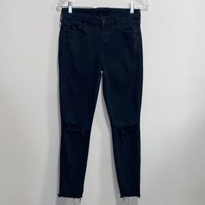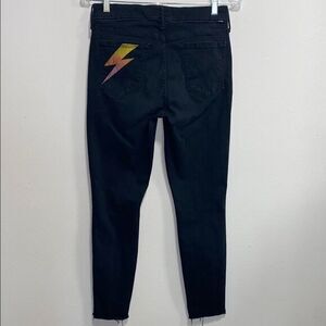 Keywords: mother jeans, the looker ankle fray, distressed skinny jeans, black denim, rainbow bolt jeans, size 27, raw hem jeans, mid rise denim, trendy skinny jeans, premium made in USA jeans