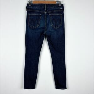 Dark blue wash denim jeans, super stretchy, cropped length.