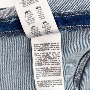 Details: Light blue wash, soft stretch denim, raw hem look, feminine drape