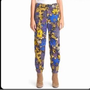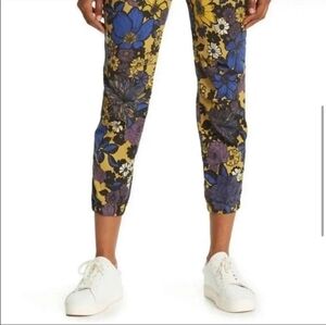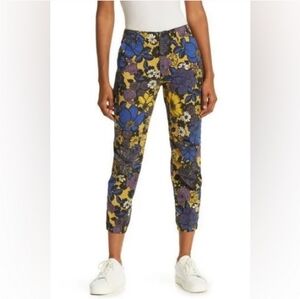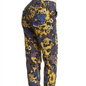 MOTHER The No Zip Misfit Jeans in Oopsie Daisy. Lovely 1970s California inspired floral print. Cropped length with a tapered slim leg. Ruched pant hem. Button fly zip. Ample back pockets.
