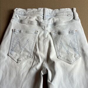 Happy hour. Time flies when you're having rum. Mother's bestselling high-rise straight leg with an exposed button fly and an ankle-length inseam. Cut from stretch denim, Pina Colada Paradise is a super-light blue wash with subtle distressed details.